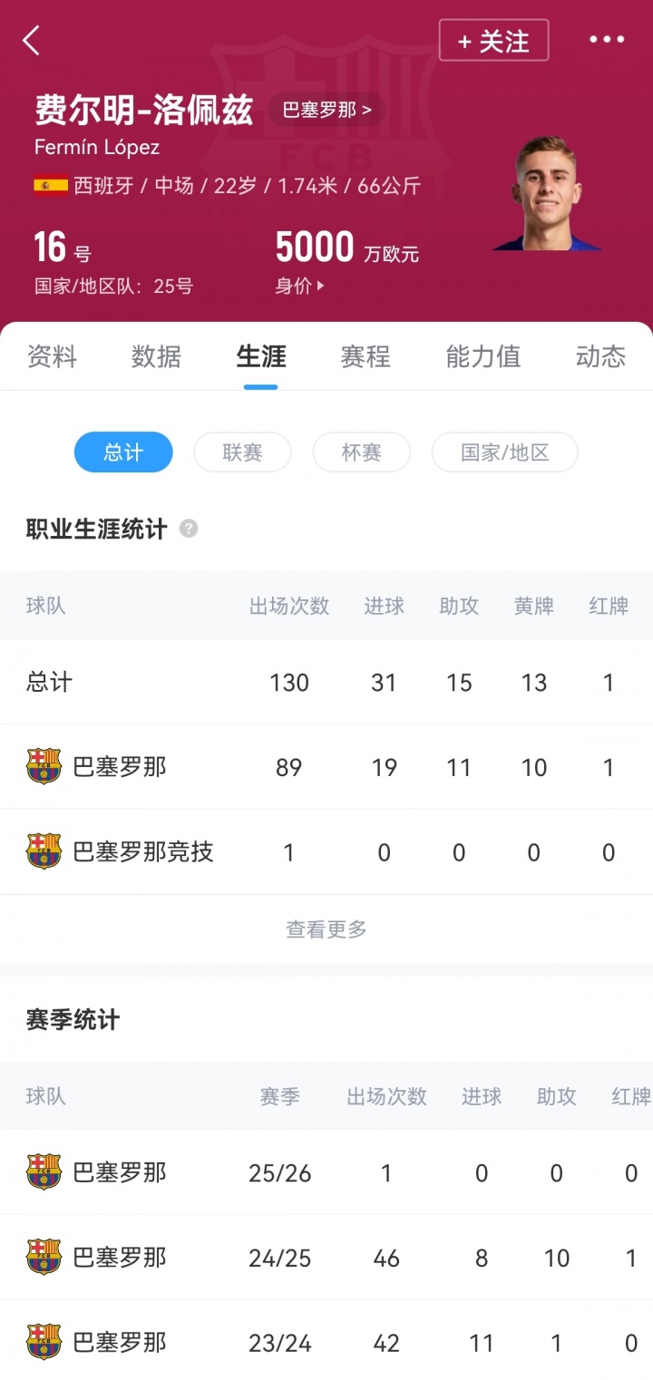 现年22岁的费尔明出自巴萨青训体系,至今代表一线队出战89场比赛,贡献19粒进球和11次助攻,目前他在德国转会市场网站上的身价为5000万欧元。